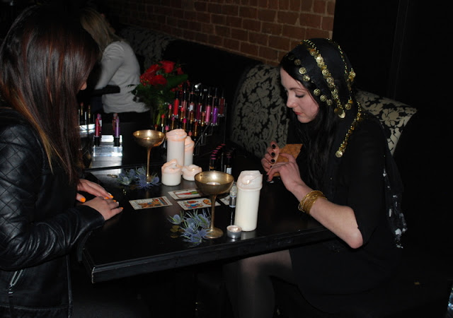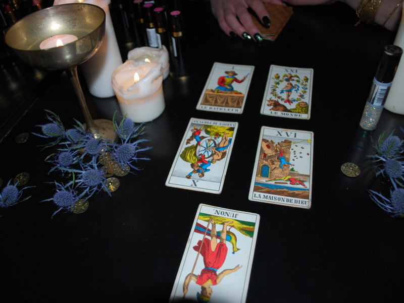 | Anna getting her tarot card and lipstick reading done |