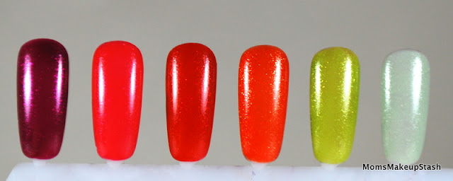 | Swatches L-R: Grape Goddess, Seduce Me Strawberry, Apple of His Eye, Mandarin Magic, Divine Lime & Honeydew Dazzle |