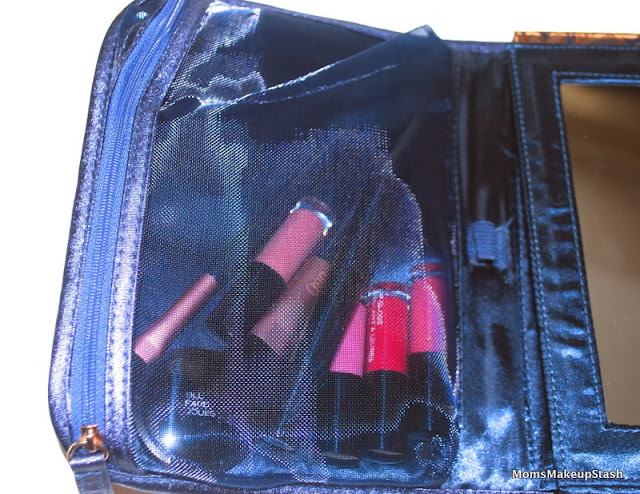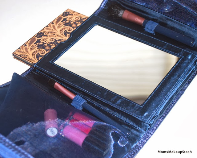 This set has everything you need to get dolled up and rush out the door. It is a really great travel option that includes 24 eye shadows encased in a gold damask palette, 4 mini lip glosses, one blush, one mascara, 2 brushes and a beauty mirror. All products come in a beautiful gold and navy piped cosmetic case.