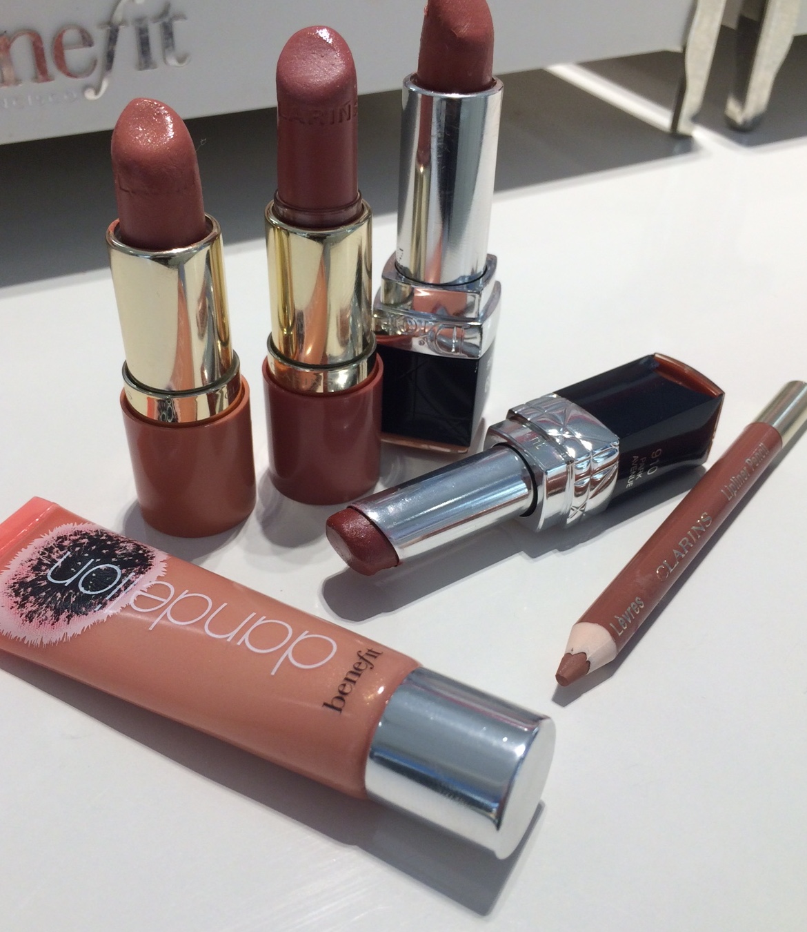 - To finish the look, she used the lightest shade of lipstick, Clarins Joli Rouge Lipstick in #747 Rosy Nude in the centre of the lips and topped everything off with a touch of Benefit Dandelion Lip Gloss. Voila!