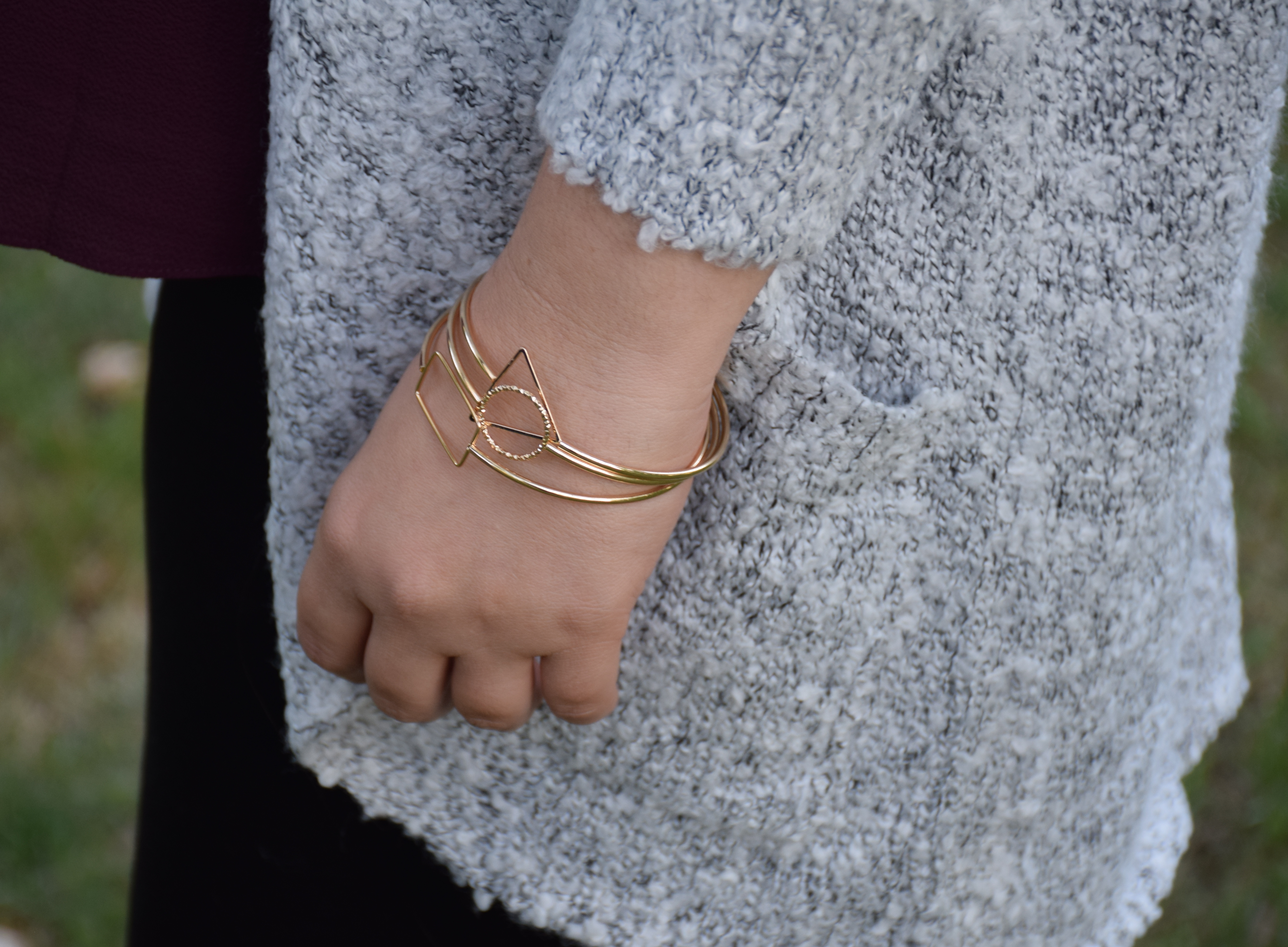 Close-up of the bracelets and sweater