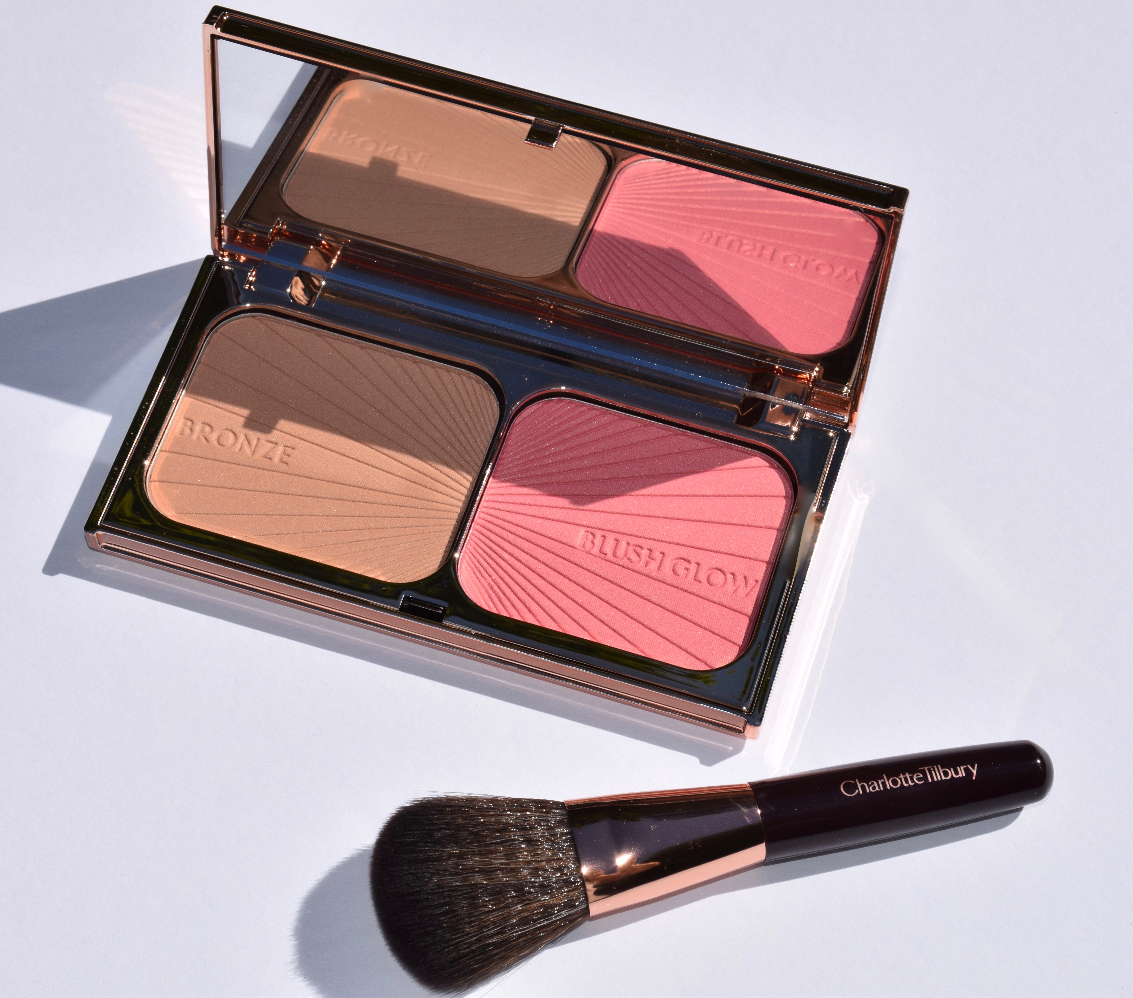 The new powder duo by Charlotte Tilbury includes a gorgeous, bronzing powder for contouring and a radiant, soft coral/pink blush. The bronzer is a blend of super-flattering pearls and pigments that help contour the face and mimic the look of naturally sun-kissed skin. It is one of the nicest formulas that I’ve ever used! The blusher contains finely crushed pearls that impart a pretty pink flush and gives skin an instant “blush of youth”.